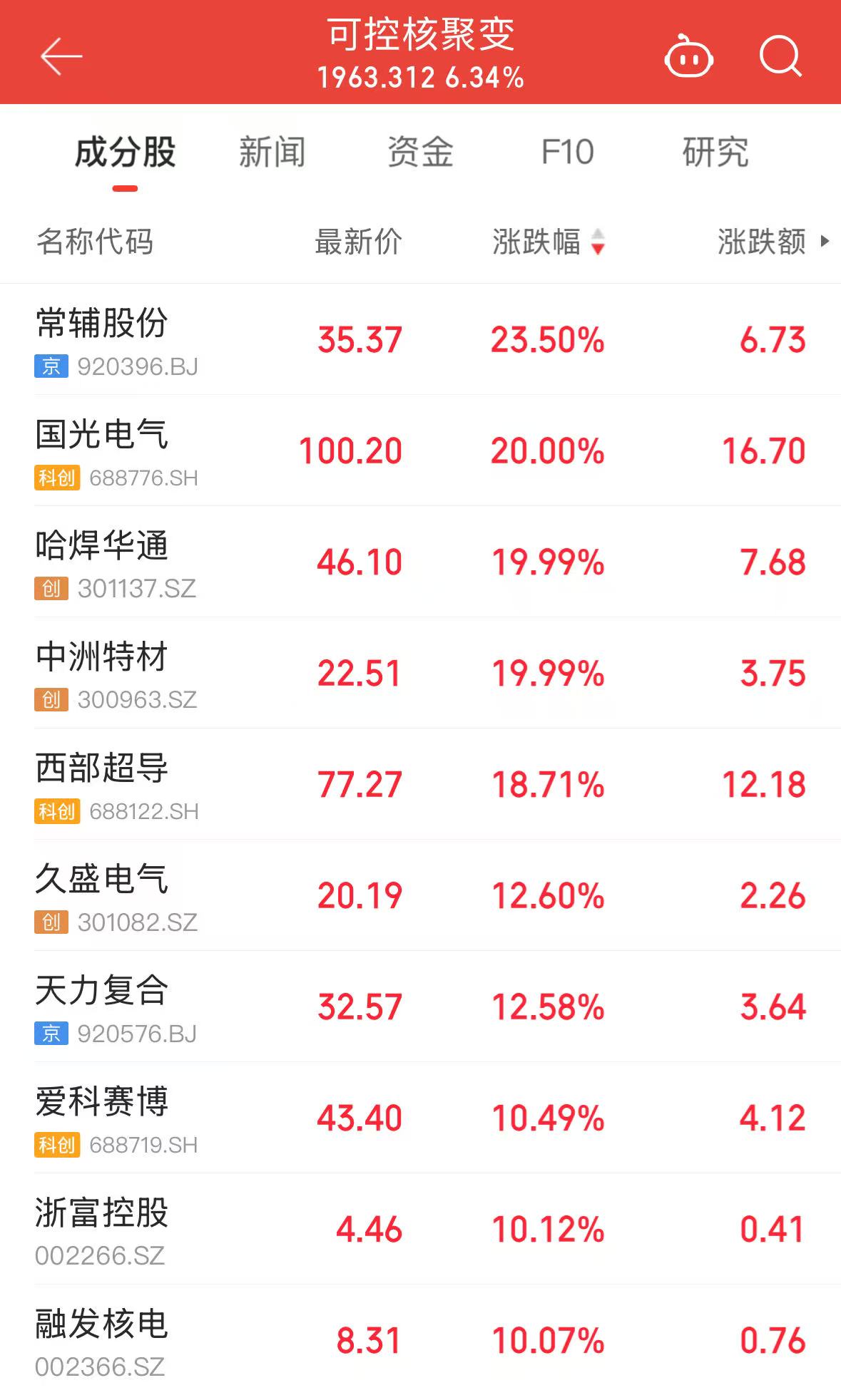 个股方面,常辅股份(920396.BJ)飙涨23.5%领跑,国光电气(688776.SH)、哈焊华通(301137.SZ)、中洲特材(300963.SZ)“20cm”涨停,西部超导(688122.SH)、久盛电气(301082.SZ)、天力复合(920576.BJ)等紧随其后,板块内涨幅超10%个股达21只。