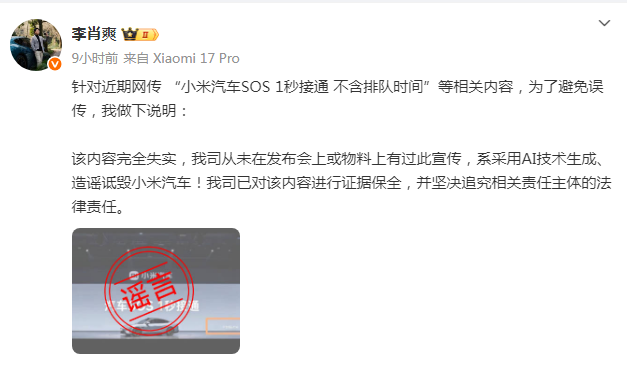 10月23日,21财经《辟谣财知道》注意到,针对近期网传 “小米汽车SOS 1秒接通 不含排队时间”等相关内容,小米汽车副总裁李肖爽发文称,该内容完全失实,公司从未在发布会上或物料上有过此宣传,系采用AI技术生成、造谣诋毁小米汽车。公司已对该内容进行证据保全,并坚决追究相关责任主体的法律责任。
